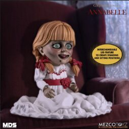 The Annabelle Deluxe Mezco Designer Series is a super-D take on the famous haunted doll! Designed after her appearance in the film Annabelle Comes Home, Annabelle wears her signature white dress with a red ribbon around her waist. She stands 6 inches tall + features 7 points of articulation, along with interchangeable legs so she can switch between standing + sitting positions. Annabelle is packaged in a sacred + collector-friendly window box, perfect for containing the evil within!