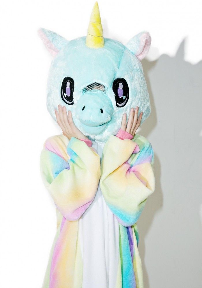 This impossibly plush, pastel blue Big Fat Unicorn Head Mask features big, beaming kawaii eyes, a spiral horn, small mesh ventilated panel for easy breathing + clear sight and a cushioned interior for cozy wear.