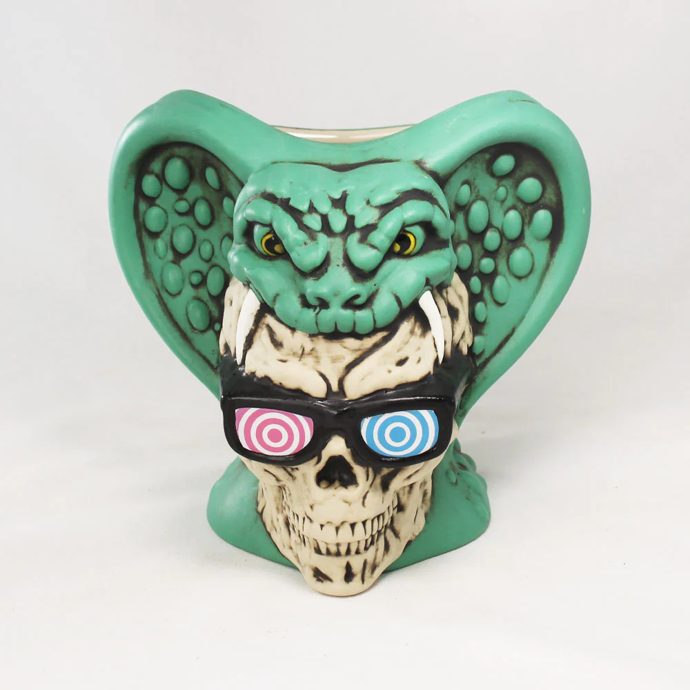 Tiki Farm’s Dirty Donny’s Cobra’s Fang comes at you with FULLY-SKULLY HYPNO EYES a’blazin’! A significant mug in terms of lowbrow design (their hallmark) + significant in scale, the design features a highly-venomous Cobra chompin’ down on an unsuspecting sunglasses-adorned Skull! The poisonous impact has brought this skull back from the dead + into a hypnotic state of being! Yes folks, this all happened! Wadda way to serve your most potent of libations! Measuring in at 5 7/8 inches height + holding a significant 24 oz. of TOXIC VENOM, get yours now and scare the holy begeezers out of your friends and family once presented with your next, very special craft cocktail!