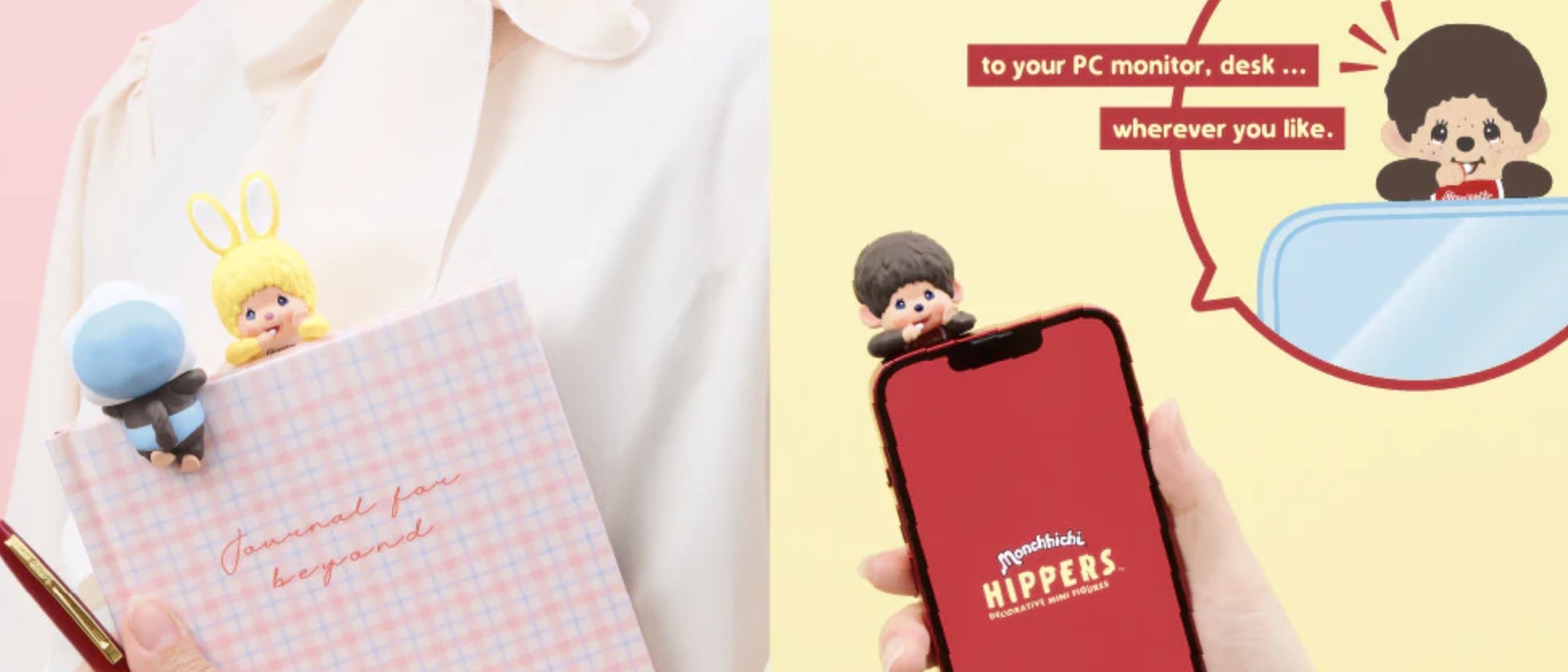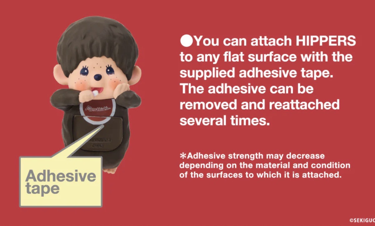 Monchhichi, the baby monkey beloved around the world, now comes as a Hipper! These decorative figures attach to things around the house with the reusable adhesive on its belly. You can stick them wherever you want, like your laptop, desk, or phone. Enjoy their adorable Monchhichi faces peeking out from the front + their plump bottoms from behind. Help celebrate their 50th anniversary by decorating your life with the Monchhichi Hippers!