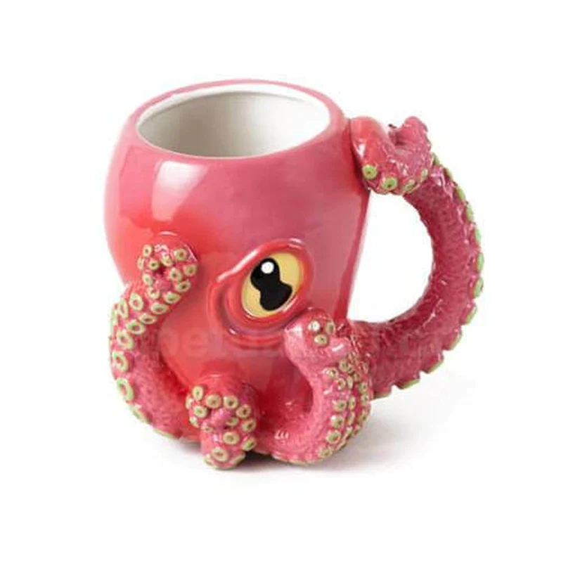 Add some deep sea delight to your morning brew with this wicked Cthulhu-inspired octopus mug! Made of glazed ceramic, the large pink octopus has two big yellow eyes + wildly twisted tentacles with lime green detailing. Hold him by the tentacle handle + sip a cup of tea or coffee straight out of his head! Stands 5 inches tall.