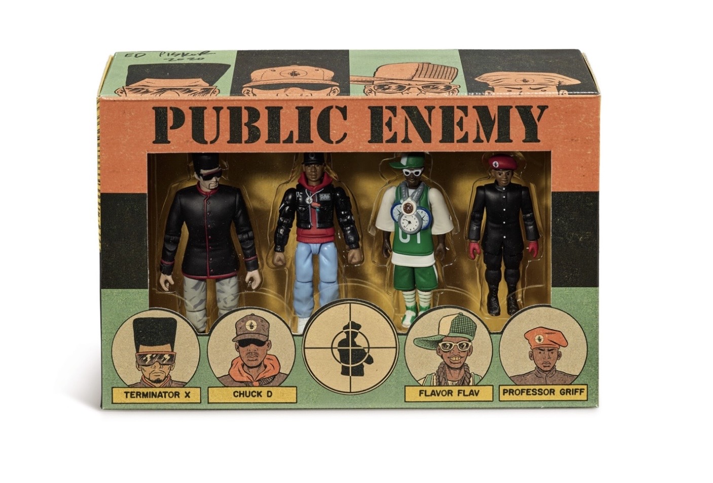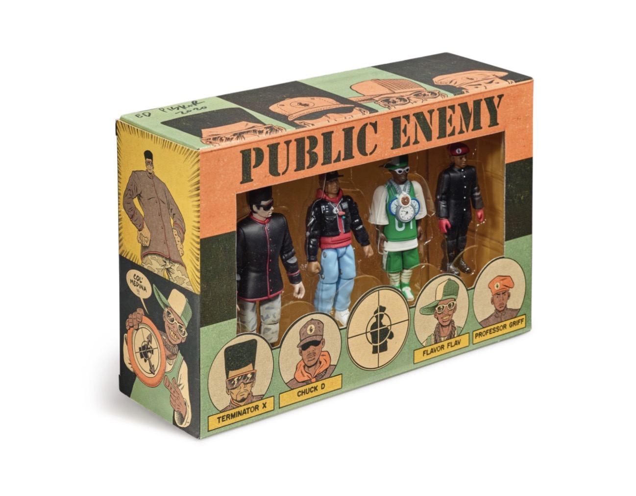 Kings of Hip Hop + inductees of the Rock + Roll Hall of Fame, Public Enemy’s first action figure set features 4 of the central members from the 80’s: Chuck D, Flavor Flav, Professor Griff + Terminator X. Both the figures + the packaging are designed by Ed Piskor, author of the New York Times Best- Selling + Eisner Award winning comic series: Hip Hop Family Tree.  Each figure stands approximately 4 inches tall. Produced in 2016 by Press Pop.