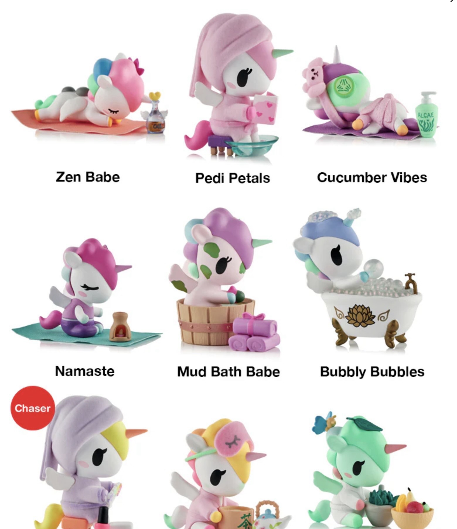 Relax, refresh + reveal a surprise! The Spa Day Unicorno Blind Box series brings pampering vibes + peaceful charm to your Unicorno collection! This relaxing 9 figure series includes characters like Zen Babe, Mud Bath Babe, Bubbly Bubbles, Pedi Petals + more! Treat yourself to a little kawaii wellness! Each figure stands approximately 3 inches tall.