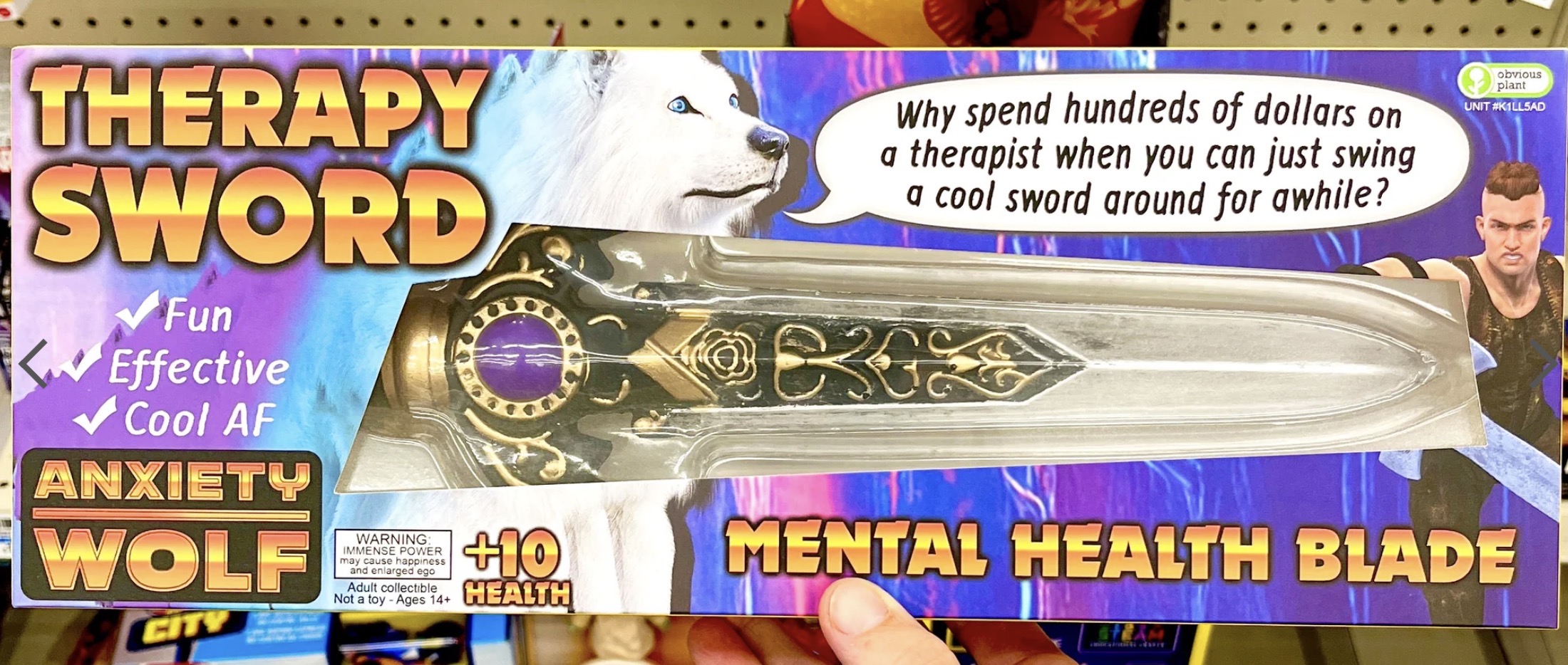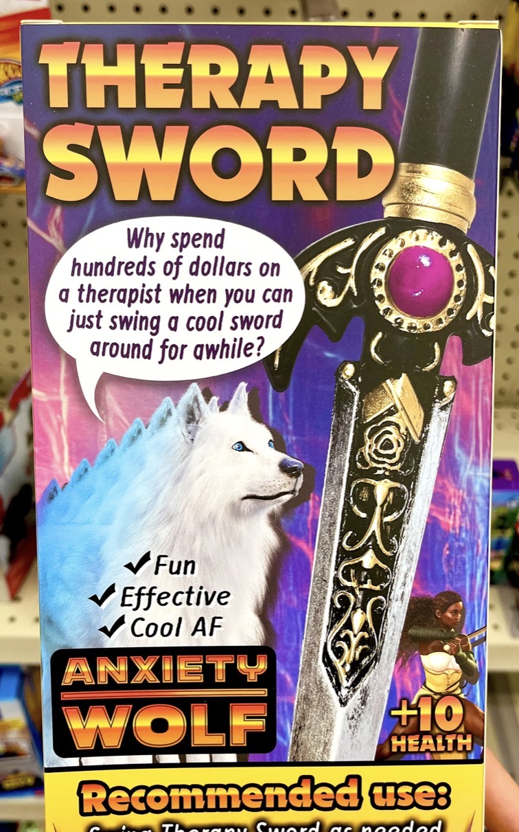 Fight your demons! Save hundreds on your mental health by just swinging this cool sword from Obvious Plant around for a while. The collectible window box design allows for easy removal + return of Therapy Sword to package. Therapy Sword is a 13-inch short sword constructed from PU foam + is part of the Anxiety Wolf product line. Quantity Produced: 1000