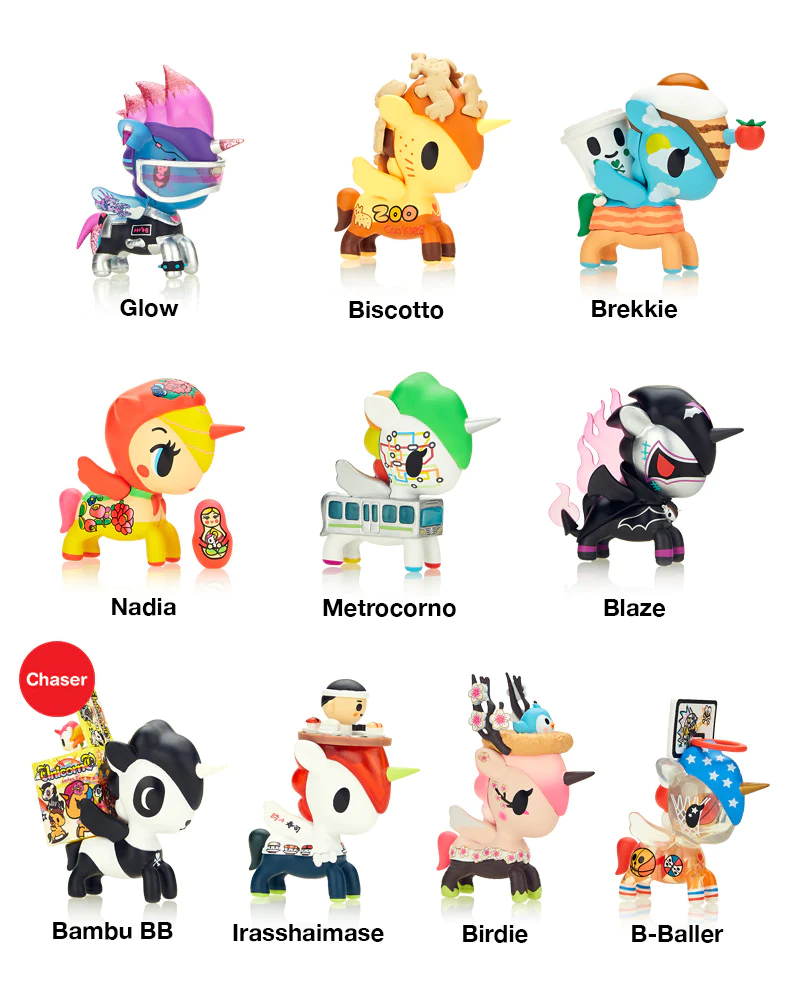 Unicorno Series 12 has arrived with more amazing Unicornos ready for adventure! This series features 10 new Unicornos who have journeyed from the magical kingdom to bring wonder + inspiration to our world. Whether you’re into basketball like B-Baller, or you love breakfast like Brekkie, or enjoy traveling through the city like Metrocorno, there is something fun for everyone! Each figure stands approximately 2.75 inches high.