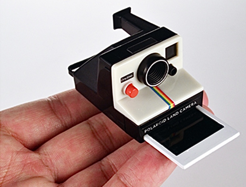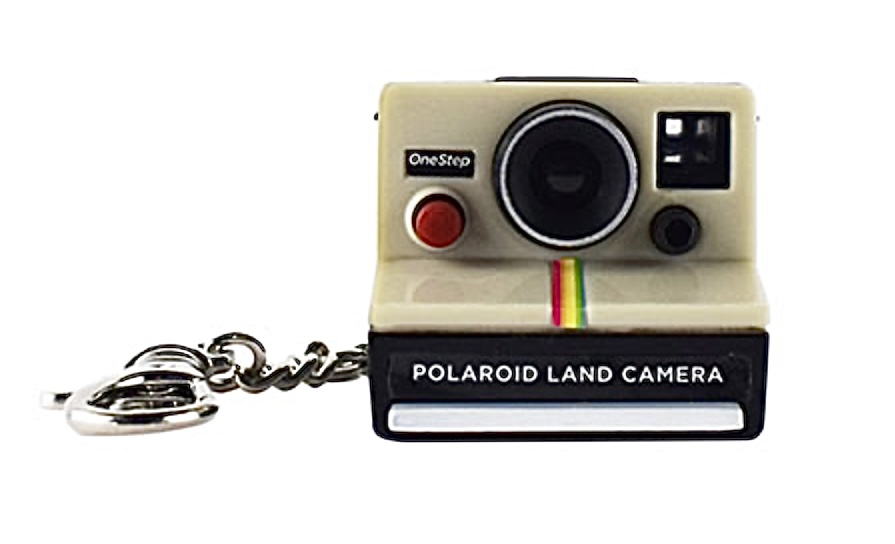 This cool keychain is a miniature replica of the original Polaroid OneStep SX-70 White/Rainbow camera, measuring only 1.5 x 1.25 x 2.0 inches! When you press the red shutter button, out slides a Polaroid picture with the iconic sound effect. Press it back in + do it all over again! Does not actually take a photo; it’s all just pretend!